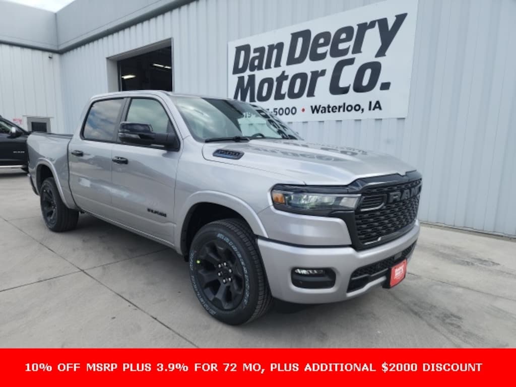 Billet Silver Metallic Clearcoat Ram 1500 4D Crew Cab Big Horn/Lone Star 3.6L V6 24V VVT 19/24 City/Highway MPG 8-Speed Automatic 4WD Price includes all applicable incentives, some customers may not qualify: $1250 - 2025 Midwest BC SFS Bonus Cash . Exp. 12/01/2025 $2000 - 2025 National Holiday Select Inventory Bonus Cash. Exp. 12/01/2025 $750 - 2025 Midwest BC Regional Bonus Cash. Exp. 12/01/2025 10% Msrp - 2025 National 10% Below MSRP . Exp. 12/01/2025 $1,000 Trade Assist Rebate, must have trade 2008 or newer, good through Dec. 31st 2025